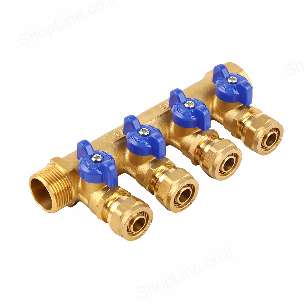 מחלק איטלקי כחול עם ברזונים 3/4 אינץ', 2 יציאות, מבית NTM. לחלוקת מים קרים במערכת הצנרת.