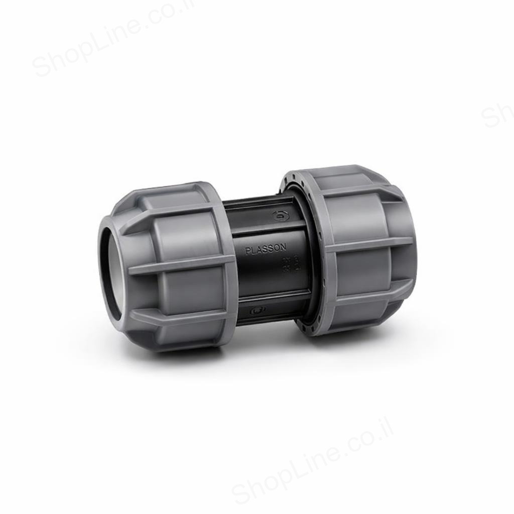 מצמד דו כיווני (כפול) 63 מ"מ מתוצרת Plasson (פלסאון). מחבר מכאני (compression fitting) לחיבור שני צינורות PE (פוליאתילן) בקוטר 63 מ"מ זה לזה. עשוי פוליפרופילן (PP) איכותי, עמיד בפני קורוזיה ותנאי חוץ. מתאים למערכות השקיה, חקלאות, גינון ותשתיות מים בקטרים גדולים. לחץ עבודה מקסימלי: 16 בר. תוצרת ישראל.